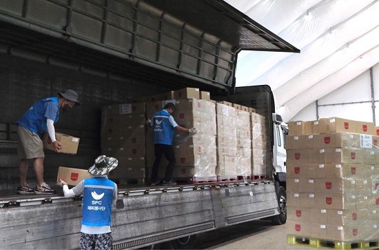 | ▲ SPC그룹 임직원들이 전북 군산 새만금 일대에서 진행되고 있는 '2023 세계스카우트잼버리' 대회 현장을 찾아 SPC삼립 빵 등을 전달하고 있다. (사진 = SPC 제공) |