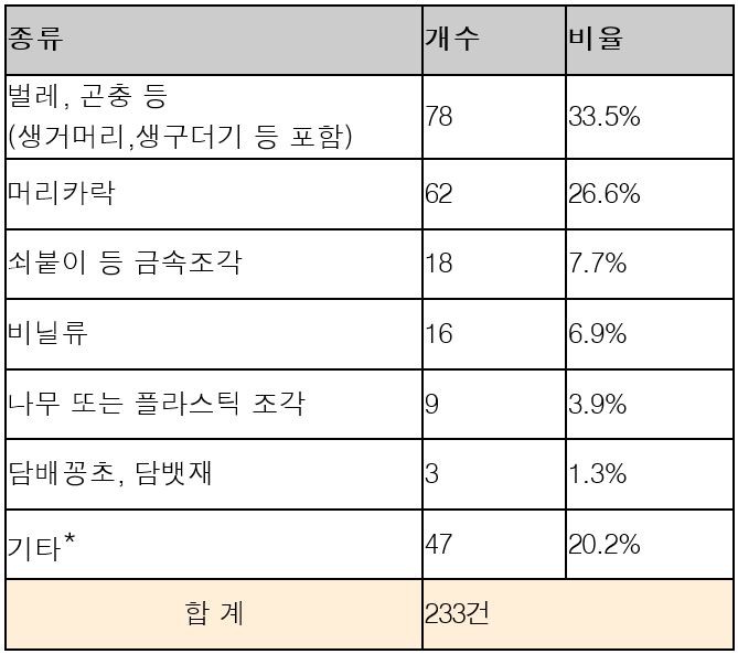 발견된 이물질 종류로는 벌레와 곤충류가 가장 많은 78건을 기록했고, 머리카락이 68건으로 비슷하게 많이 발견됐다. 이외에도 쇠붙이 등 금속조각(18건), 비닐류(16건), 나무  또는 플라스틱 조각(9건) 순으로 다수 발견됐다.