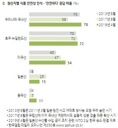 4월 16~18일 전국성인 1001명에게 국내에 유통되는 일본산, 중국산, 미국산, 호주·뉴질랜드산 수입 식품과 우리나라 국내산 식품 각각에 대해 대체로 안전하다고 보는지, 안전하지 않다고 보는지 한국갤럽이 물었다.