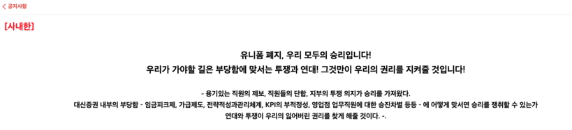 -대신증권지부, 유니폼 착용 전면 철회 촉구...“대표이사의 명령에 의해 언제고 철회될 수 있어 유니폼 착용 강제 될 수도”