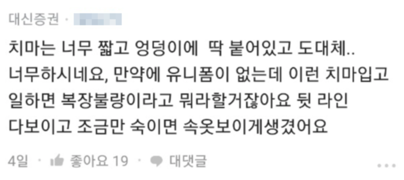하계 유니폼 논란과 관련해 대신증권지부 카페와 익명 앱(불라인드)에는 ‘허벅지의 반 이상이 드러나는 기장이다.’, ‘여성의 특정부위가 부각된다.’ 등 불만을 토로하는 직원들의 반발 움직임이 거세다.