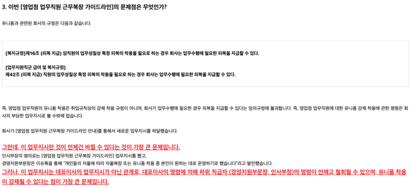 그러면서 “이 업무지시는 대표이사의 업무지시가 아닌 관계로, 대표이사의 명령에 의해 하위 직급자(경영지원부문장, 인사부장)의 명령이 언제고 철회될 수 있으며, 유니폼 착용이 강제될 수 있다”라고 꼬집었다.