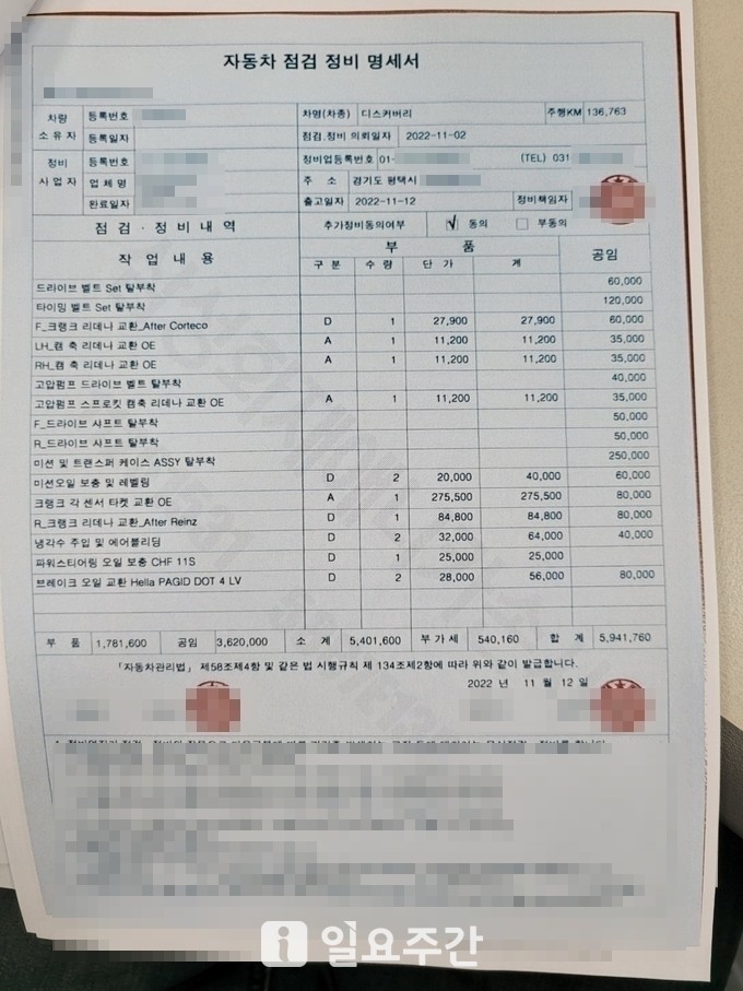 ▲A 씨가 인천 서에 위치한 중고차 매장에서 구입한 랜드로버 디스커버리 차량의 수리비용.(사진=제보자 제공) |