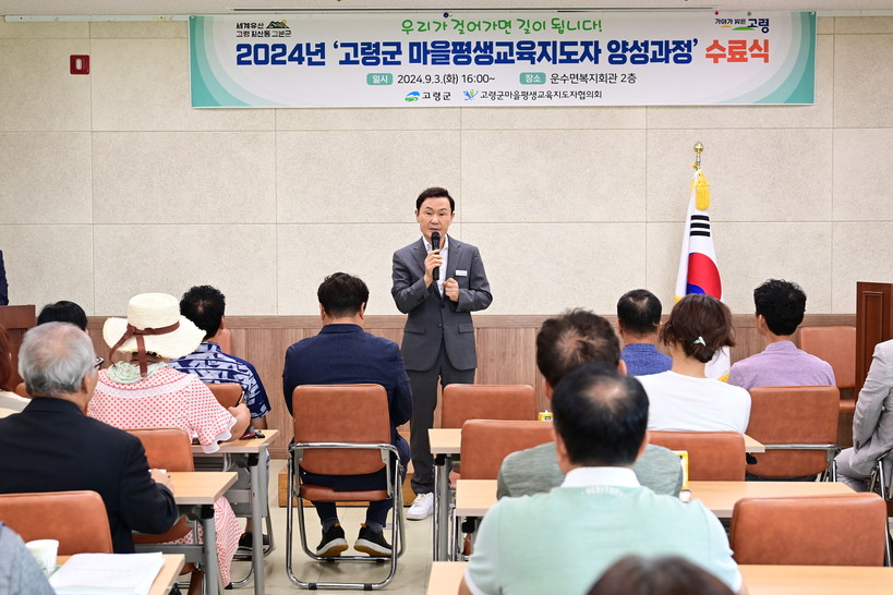 [일요주간=최부건 기자] 고령군(군수 이남철)은 9월 3일(화) 16시, 운수면복지회관 2층에서 수강생 및 평생교육지도자협의회 임원 및 각 읍면 지부장 등 40명이 참석한 가운데 ‘2024년 마을평생교육지도자 양성사업 수료식’을 개최하였다.