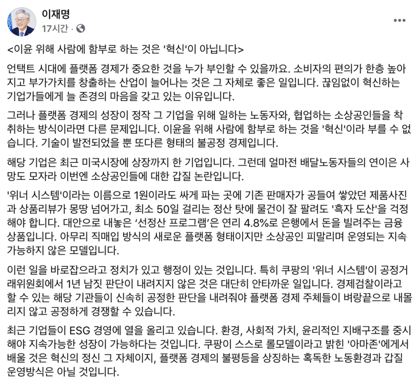 ▲ 이재명 경기도지사가 지난 5일 자신의 페이스북에 게자한 쿠팡 관련 글 캡쳐. |