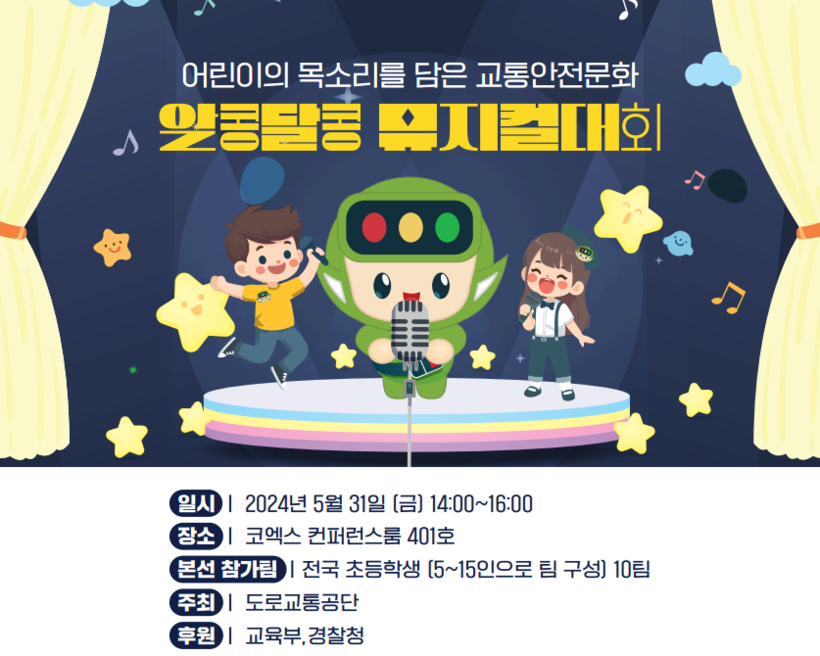 도로교통공단(이사장 직무대행 서범규)이 주최하고 교육부(장관 이주호)와 경찰청(청장 윤희근)이 후원하는 어린이 교통사고 예방을 위한 ‘제2회 알콩달콩 뮤지컬 대회’ 본선을 5월 31일(금) 2시부터 코엑스 컨퍼런스룸 401호에서 공개 방청으로 진행한다.