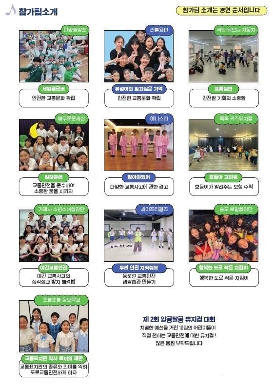 한편, 어린이의 목소리를 담은 교통안전문화 ‘제2회 알콩달콩 뮤지컬대회’는 국민 누구나 관람할 수 있는 공개방청으로 진행한다.