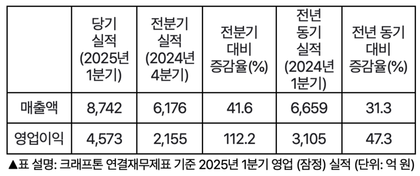 크래프톤은 29일 열린 기업설명회(IR)에서 2025년 1분기 매출 8742억 원, 영업이익 4573억 원을 기록했다고 발표했다. 이는 전년 동기 대비 각각 31.3%, 47.3% 증가한 수치로 분기 기준 역대 최고 실적이다.
