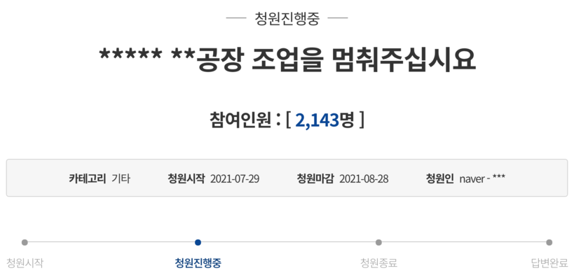 지난 29일 청와대 청원게시판에는 ‘***** **공장 조업을 멈춰주십시요’라는 제목의 글이 올라와 논란이 커지고 있다.