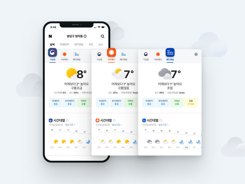 네이버는 기상이변이 잦고 계절별 특성을 고려해 지난달 초부터 기상청 예보 데이터에 글로벌 날씨 전문 기업인 웨더채널(Weather Channel), 아큐웨더(Accuweather)의 국내 6000여 개 지역의 날씨 예보 정보를 더해 제공하고 있다.