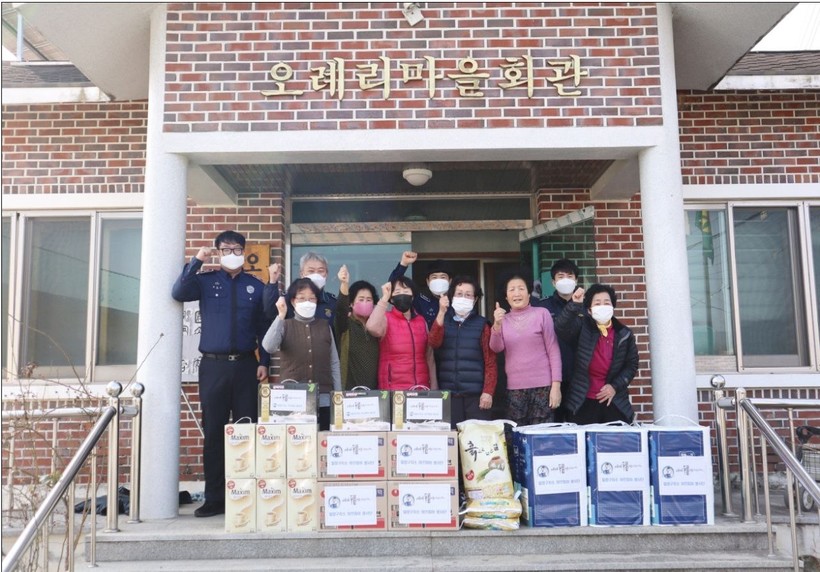 | ▲ 오례리 마을회관 앞에서 물품전달 후 직원들과 마을주민들이 기념촬영을 하고 있다. |