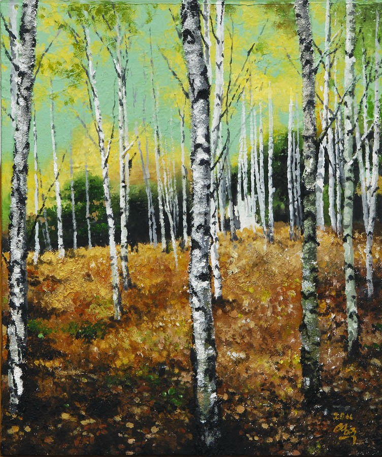 “나의 삶속에서 나는 자연과 더불어 살았다. 골판지를 재료로 꿈을 꾸듯 아름다운 자연을 그리고 싶었다. 숭숭 뚫린 골판지를 잘라 하나하나 붙여나가니, 그 위에 그려야 할 자연들이 너무 많아졌다. 잊혀져가는 기찻길을 소재로 시작하였고 자작나무 시리즈와 아름다운 자연을 배경으로 작품을 구상해 나갔다.”
