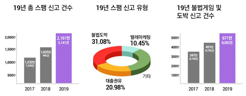 이는 전년 대비 33%가 증가한 수치로 하루 평균 약 5만 9000여건 의 스팸 신고가 접수된 셈이다.