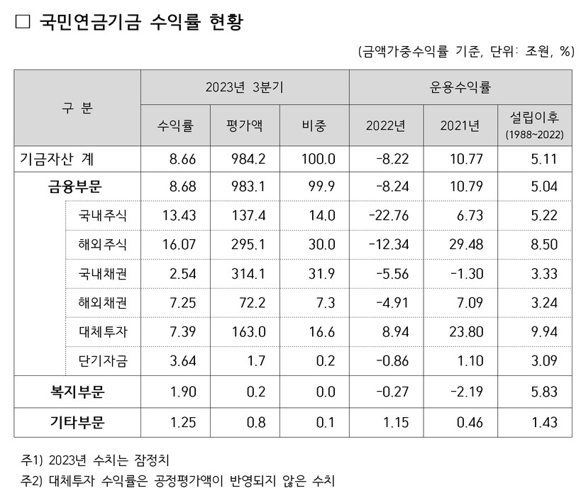 [일요주간=김영란 기자] 국민연금공단(이사장 김태현) 기금운용본부는 2023년 1~9월 국민연금기금 수익률이 8.66%(잠정)를 기록했다고 29일 밝혔다.