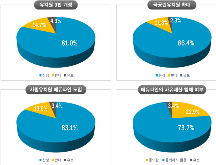 지난달 27일 교육부가 성인 남녀 1049명을 대상으로 실시한 ‘유아교육 공공성 강화 방안’ 여론조사 결과 '유치원 3법' 추진에 81%가 찬성하는 것으로 나타났으며, 국가관리 회계 시스템인 에듀파인 도입 방안에도 83.1%가 찬성한다고 응답했다. 아울러 정부가 추진 중인 국·공립 유치원 확대 방안과 관련해서도 86.4%가 찬성해 당국의 유치원 공공성 강화 대책에 긍정적 반응이 우세한 것으로 조사됐다.