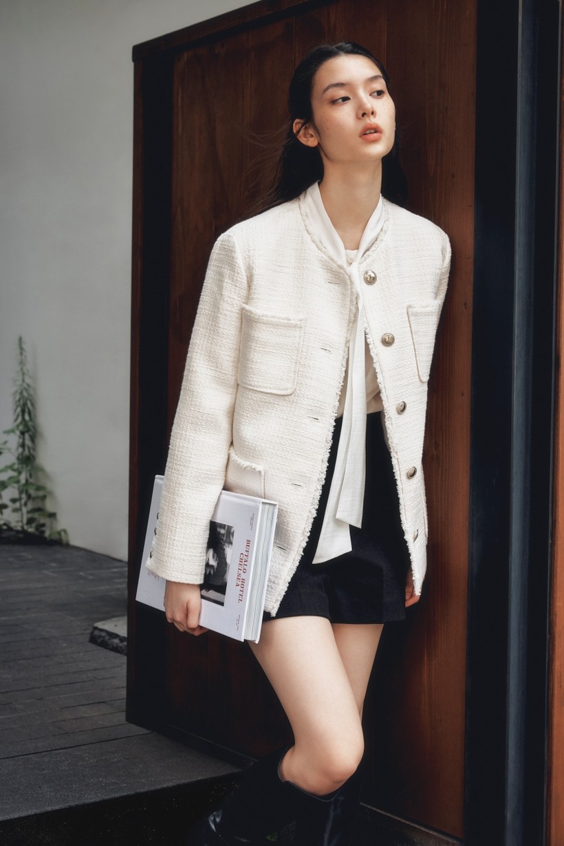 이번 시즌 처음 선보이는 미디 트위드 자켓은 깔끔한 트위드 조직과 적절한 두께감, 탄탄한 터치감으로 완성도 높은 실루엣을 구현했다. 매 시즌 베스트셀러인 칼라리스 트위드 자켓은 고객 의견을 반영해 기장과 소매를 1cm 늘리고 4가지 사이즈로 제공해 체형 선택 폭을 넓혔다. 넥 라인부터 밑단까지 수술 장식을 더하고 소매 탈부착이 가능한 배색 블라우스를 적용했으며, 안감에는 고급 트윌 소재를 사용해 품질을 높였다.