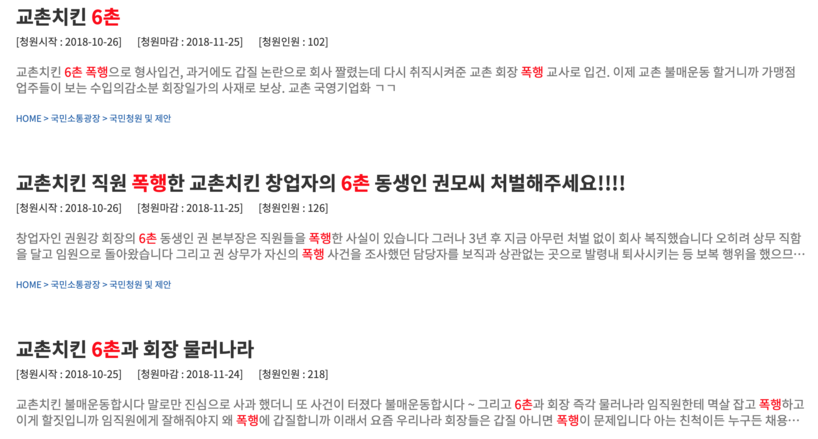 | ▲교촌치킨 창업주의 친인척이 직원을 폭행한 영상이 공개 된 이후 청와대 청원 게시판에 올라온 청원글. |