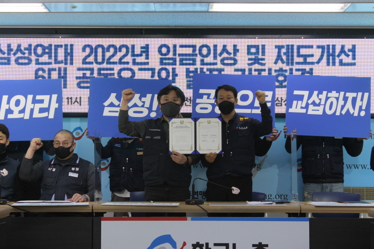 | ▲삼성연대는 8일 2022년 임금인상 및 제도개선 6대 공동요구안을 발표했다. |