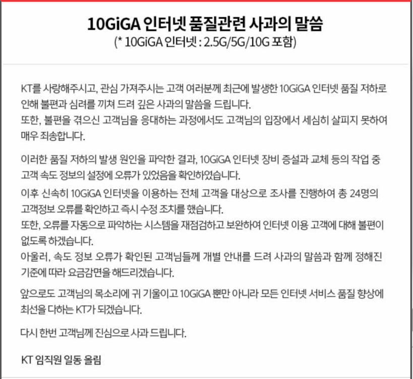 KT는 "최근에 발생한 10기가 인터넷 품질 저하로 인해 불편과 심려를 끼쳐 드려 깊은 사과의 말씀을 드린다"면서 "품질 저하의 발생 원인을 파악한 결과, 10기가 인터넷 장비 증설과 교체 등 작업 중 고객 속도 정보 설정에 오류가 있었음을 확인했다"고 밝혔다.