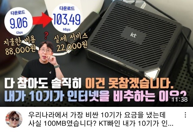 | ▲유명 유튜버 잇섭은 지난 17일 자신의 유튜브 채널을 통해 KT 10기가 인터넷 속도의 문제점을 폭로했다.(사진=유유브 채널 잇섭 캡쳐) |