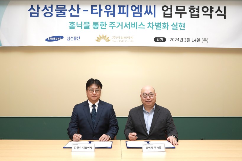 협약식에는 삼성물산 주택사업본부장 김명석 부사장과 타워피엠씨 강민수 부회장 등 양사의 주요 관계자들이 참석해 다양한 브랜드의 기존 공동주택에도 ‘홈닉’ 서비스를 확대 적용할 수 있는 협력 방안을 논의한다.
