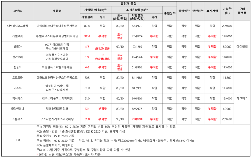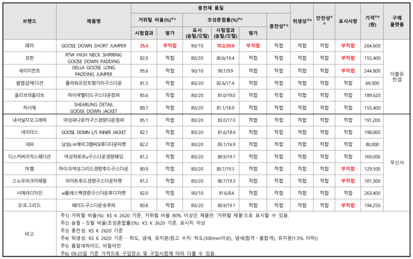 2개 제품(벨리아, 젠아흐레)은 온라인에는 구스다운으로 표시돼 있었지만 실제 제품은 덕다운으로 표기돼 정보 불일치가 나타났다. 해당 제품의 실제 거위털 함량은 1.9~4.7% 수준으로 사실상 오리털 제품이었다.
