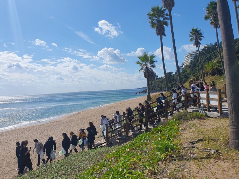 참가자들에게는 호텔에서 버려지는 폐린넨을 활용해 만든 면주머니와 폐플라스틱을 재활용한 업사이클링 집게, 봉투, 장갑 등이 제공됐으며 롯데호텔 제주에서 시작해 중문관광단지 인근 올레길을 걸으며 쓰레기를 주웠다.