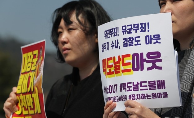 ▲ 맥도날드 해피밀 세트를 먹고 '햄버거병'으로 알려진 용혈성요독증후군으로 신장장애 2급을 받아 매일 복막투석치료를 받고 있는 시은(가명)이 엄마 최은주(왼쪽)씨가 '정치하는 엄마들' 회원들과 함께 지난 4월 3일 청와대 분수대 앞에서 '한국맥도날드 햄버거병 국가배상청구소송' 기자회견을 하고 있다. 앞서 지난 2017년 햄버거병 의혹 사건을 수사한 검찰은 지난해 2월 피해자들이 입은 상해가 맥도날드에서 판매한 햄버거 때문이라고 볼 증거가 부족하다며 불기소 처분을 내린 바 있다. /출처=newsis. |
