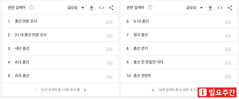 ▲ 총선 관련 검색어 1위-10위 (이미지편집=일요주간) |
