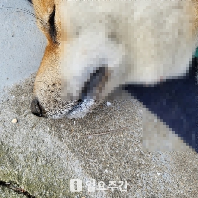 ▲독극물이 들어있는 음식물을 먹은 뒤 입에 거품을 물고 죽어 있는 반려견.(사진=제보자 제공) |