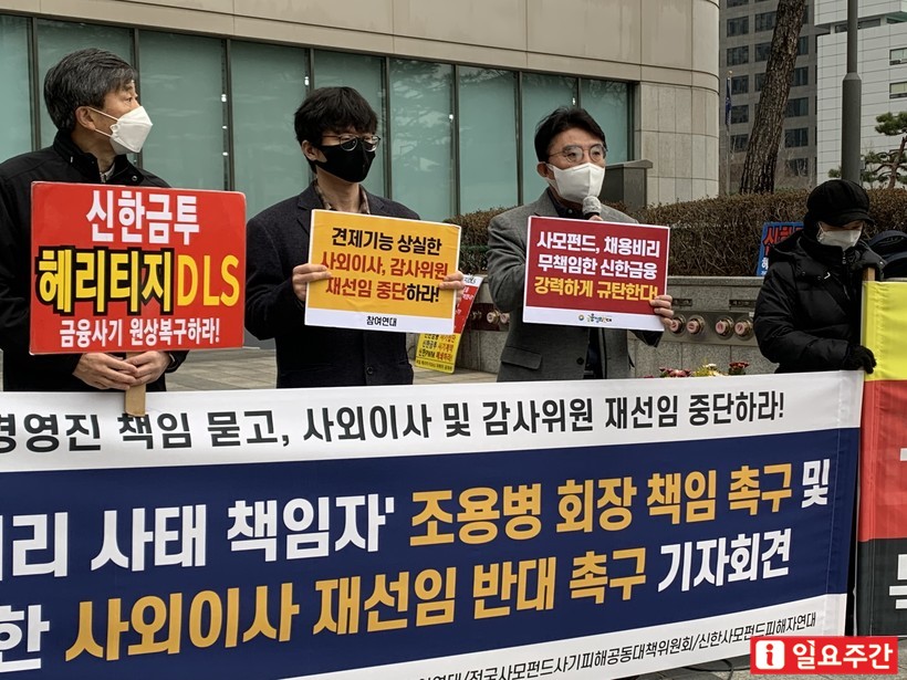 이들은 “신한지주는 지난해에도 라임펀드 환매중단 사태에 대한 경영진의 책임을 제대로 묻지 않았고 책임자인 조용병 회장을 해임하라는 시민사회의 요구를 무시한 채 배당금 잔치만 벌인 바 있다”라며 “사모펀드 사태로 이미 신한금융에 대한 신뢰도가 하락한 상황임에도 경영진과 사외이사들은 서로 자신의 자리를 지키는 데만 혈안이 된 모양새”라고 비난했다.