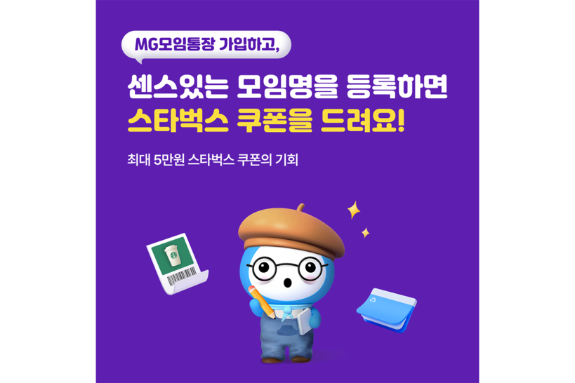 두 번째는 ‘MG모임통장 이름을 부탁해!’ 이벤트로 1일부터 다음 달 31일까지 모임통장 서비스에 가입한 고객이 자신만의 개성넘치고 센스있는 모임명을 설정하고 응모하면 된다. 이벤트 참여자를 대상으로 추첨을 통해 ▲스타벅스 5만 원권(10명) ▲ 스타벅스 3만 원권(50명) ▲ 스타벅스 1만 원권(100명)을 지급할 예정이다.