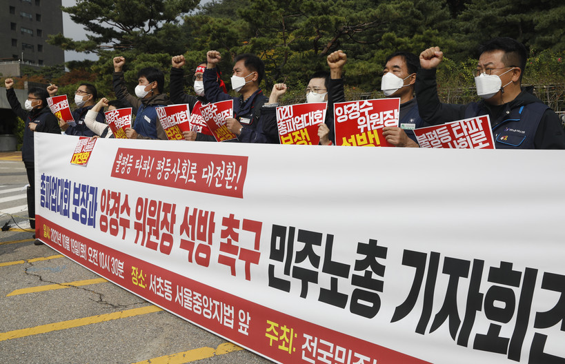 ▲ 전국민주노동조합총연맹 회원들이 19일 서울중앙지방법원 앞에서 '총파업대회 보장과 양경수 위원장 석방 촉구 민주노총 기자회견'을 열고 구호를 외치고 있다. (사진=뉴시스)