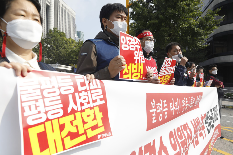 ▲ 전국민주노동조합총연맹(민주노총) 조합원들이 7일 오전 서울 중구 민주노총 회의장에서 불평등 OUT! 평등사회로 대전환 민주노총 총파업을 선포하는 구호를 외치고 있다. (사진=뉴시스)