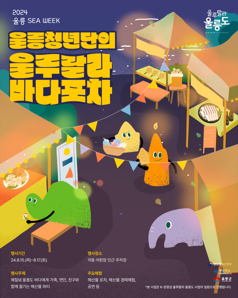 이번 <울루랄라 바다포차>는 2023년 문화체육관광부 공모사업에 선정된 「가고싶은 k-관광섬 육성사업」으로 해양레저 체험 50% 할인 해주는 <해양레저 페스타>사업과 함께 여름에 울릉도를 방문하는 관광객들에게 촛대바위를 배경으로 버스킹 공연과 바다를 바라보며 울릉도 해산물을 맛볼 수 있는 기회를 제공할 예정이다.
