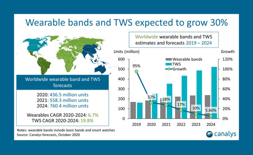 카날리스는 올해 스마트 액세서리 시장은 4억 3650만 대를 기록했으며, 내년에는 5억 5830만 대, 2024년에는 7억 6040만 대를 기록할 것이라고 설명했으며, 특히 이어웨어 '무선 이어폰'의 성장이 두드러질 것이라 전했다.