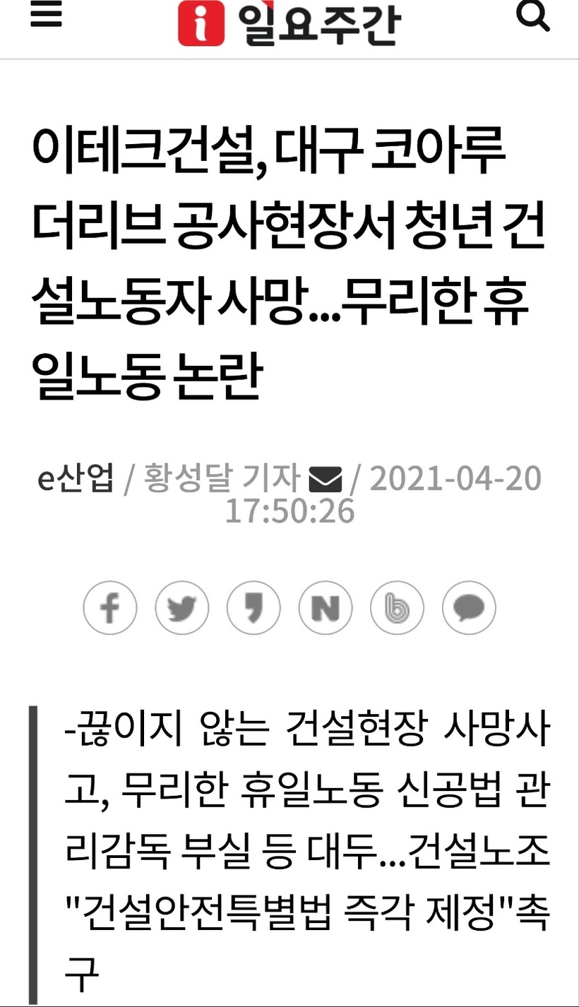 | ▲지난해 4월 이테크건설 사망사고 관련 본지 보도기사 갈무리. |