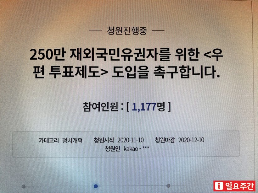 [일요주간/샌프란시스코=정승덕 기자] 올해 미국 대선에서 신종 코로나바이러스 감염증(코로나19) 사태로 일부 유권자들이 우편투표로 선거에 참여해 주목을 받은 가운데 지난 10일 청와대 국민청원게시판에 재외국민의 우편투표를 도입해 달라는 국민청원이 올라와 현재 1175명이 참여했다.