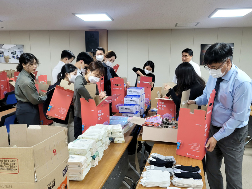 | ▲신협 관계자들이 소재지 인근의 어려운 이웃에게 전달하기 위한 생필품을 ‘어부바 박스’에 담아 포장하는 모습.(사진=신협중앙회) |