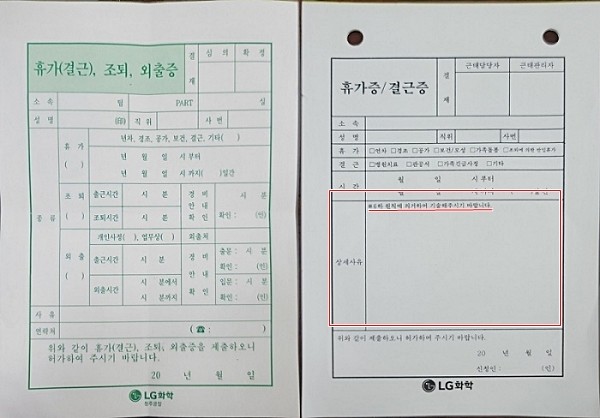 ▲ 기존 LG화학 휴가증(왼쪽)과 바뀐 휴가증. 빨간 선 안에 6하 원칙에 의거하여 기술해달라는 문구가 삽입되어 있음을 확인할 수 있다. <사진=LG화학 노동조합> |