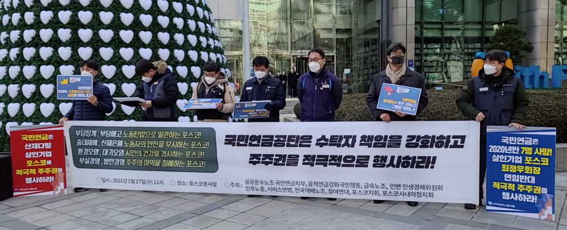 27일 오전 11시 서울 강남구 테헤란로 포스코센터 앞에서는 공공운수노조 국민연금지부, 참여연대, 포스코지회 등 노동단체와 시민단체들이 참석해 포스코가 환경오염, 산업재해 등의 책임을 지지 않고 있다고 주장하며 포스코의 대주주(11.43%)인 국민연금이 적극적인 주주권을 행사할 것을 촉구하는 기자회견을 개최하고 이 같이 밝혔다.