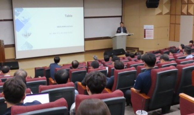 | ▲ 미디움 현영권 대표가 제1회 산학협력포럼 발표를 통해 하이퍼스피드 블록체인을 설명하고 있다.(사진=미디움 제공) |