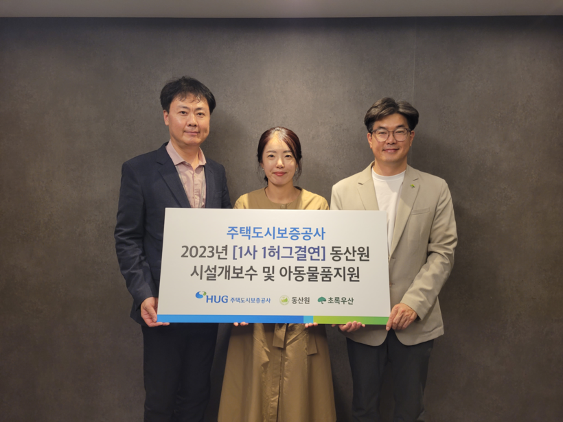 ▲ ‘1사 1허그결연’ 동산원 시설 개보수 및 아동물품 지원 전달식(왼쪽부터 HUG 허지행 홍보실장, 동산원 김은형 원장, 초록우산 어린이재단 노희헌 부산지역본부장) (사진=HUG) |