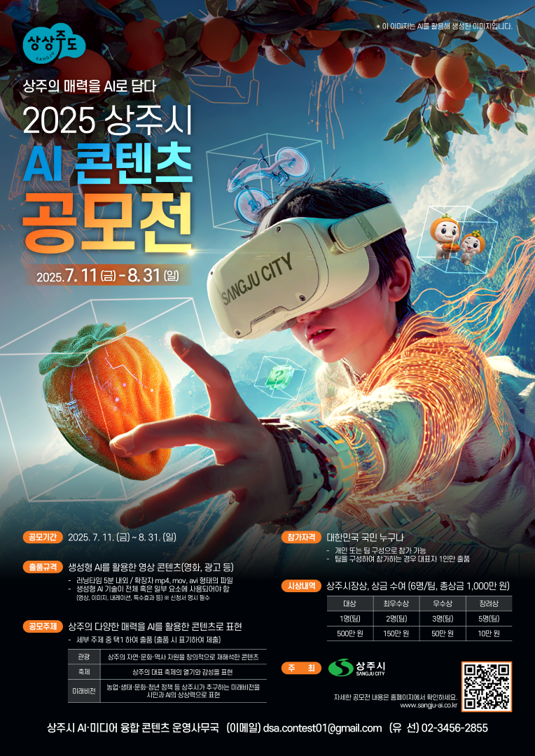 강영석 상주시장은 “이번 공모전은 시민이 직접 AI 기술을 활용해 상주의 이야기를 새롭게 만들어가는 뜻깊은 자리”이며 “디지털과 창의성이 결합된 콘텐츠가 시정에 활력을 불어넣고, 상주의 매력을 더 많은 이들과 나누는 계기가 되길 기대한다.”고 밝혔다.