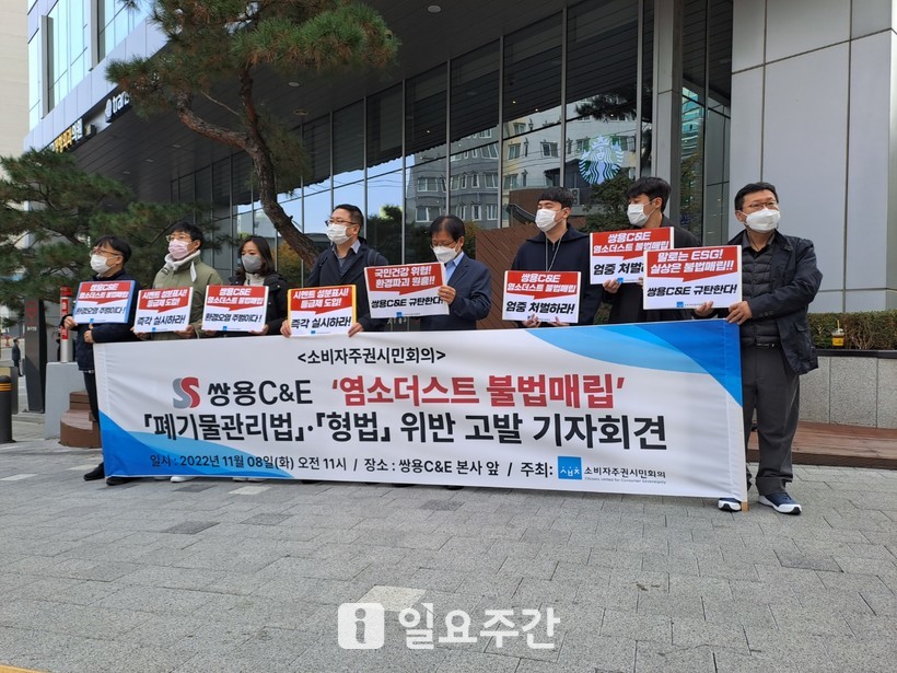 소비자주권시민회의는 8일 오전 11시 쌍용C&E 본사 앞에서 기자회견을 열고 쌍용C&E의 중금속 등이 함유된 유해물질 불법매립 의혹에 대한 철저한 수사와 엄중 처벌을 촉구했다.