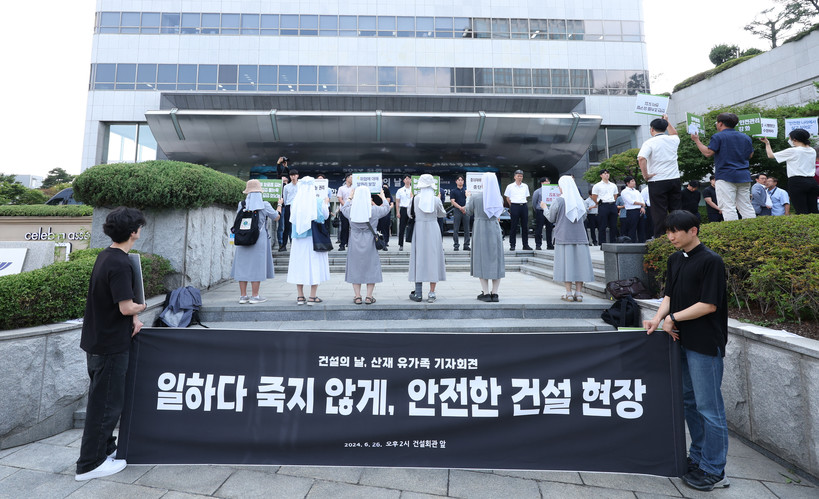 | ▲ 건설현장 산업재해 사망 노동자 유가족과 건설노조, 시민단체 회원들이 지난 6월 26일 건설의 날 기념식이 열리고 있는 서울 강남구 건설회관 입구에서 건설현장 안전을 촉구하는 피케팅을 하고 있다. (사진=newsis) |