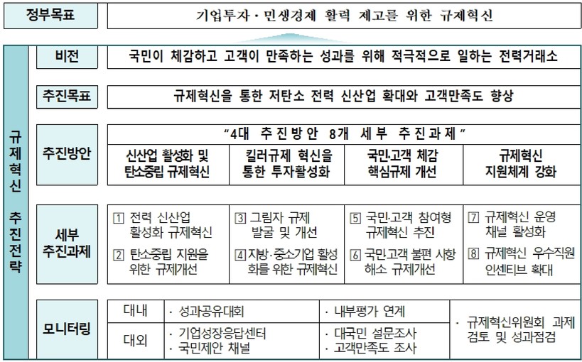 2023년도 규제혁신 추진계획을 살펴보면 ▲신산업 활성화 및 탄소중립 규제혁신 ▲킬러규제 혁신을 통한 투자활성화 ▲국민·고객 체감 핵심규제 개선 ▲규제혁신 지원체계 강화라는 4대 추진방안을 설정하고, 8개 세부 추진과제를 수립하였다. 이번 규제혁신 추진계획은 법률, 에너지, 전력시장 및 계통 전문가로 구성된 규제혁신위원회의 의결을 통해 공식적으로 추진되며 과제 발굴에서부터 평가, 점검까지 국민의 참여 채널이 대폭 확대되어 다양한 분야에서 국민 체감형 우수성과를 창출할 것으로 기대된다.