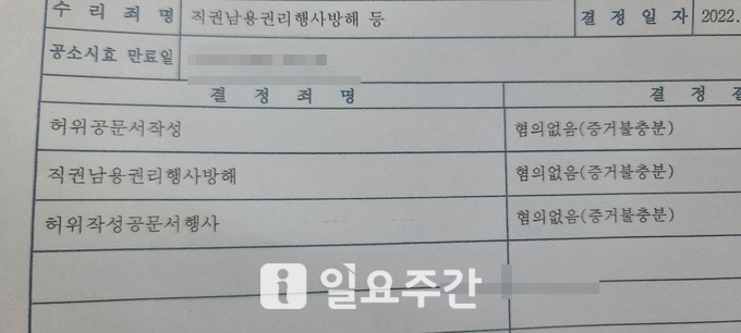 ▲경찰에서 C 검사의 비위 사건에 대해 기소 의견으로 검찰에 송치했지만 검찰은 C 검사와 관련된 사건을 증거불충분을 이유로 혐의없음으로 최종 종결했다.(자료=제보자 제공) |