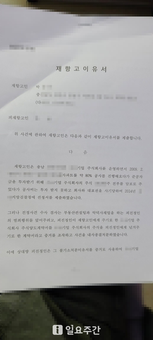 A 씨는 “20여 년 넘게 운영한 수십억 원의 가치를 가진 회사를 부당하게 잃게 되고 10년 넘게 일해 온 아파트 권리도 잃어 아파트사업을 위해 쓴 40억 원이 넘는 채무를 부담하며 절박한 상황에 처해 있다”고 호소했다.