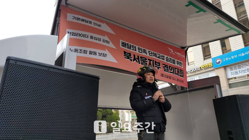 민주노총 배달플랫폼노조(북서울지부)는 20일 오후 3시 서울 마포구에 위치한 공덕 B마트 앞에서 기자회견을 열고 라이더에게 지급하는 기본배달료 인상을 촉구했다.